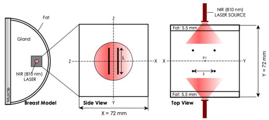 Light Distribution. The optical diffusion approximation of the transport theory [33] was used to describe light distribution due to the dominance of scattering over absorption in biological tissues. Assuming that the light source was a continuous wave Gaussian NIR laser beam that was incident onto the breast model, the can be defined by