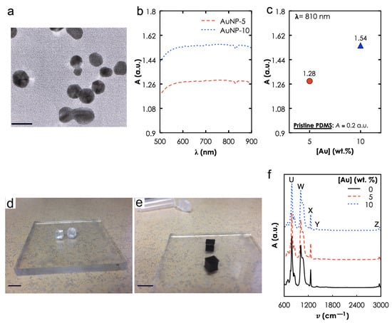 Materials characterization results. (a) Transmission electron microscopy (TEM) of the Au nanoparticles (AuNPs), Scale bar: 30 nm, (b) UV-vis-near infrared (NIR) absorbance spectra of the Gold and Poly dimethylsiloxane (Au-PDMS) nanocomposites at different [Au]: 5 and 10%. Absorbance as a function of (c) wavelength (λ) and (d) [Au] at λ = 810 nm. Photographs of fabricated samples (Scale bar: 4.5 mm): (d) AuNP-0 and (e) AuNP-10. (f) Fourier transform infra-red of all three samples.