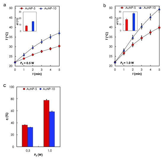 Photothermal heating in aqueous solution. The photothermal heat generation performance of the photoseeds in aqueous solution was evaluated based on initial (after s) heating rate, dT/dt, temperature rise, , and the corresponding , following 5 min of irradiation at two different W). Table 3 and Figure 4 summarize the results. As expected, dT/dt and increased with and [Au] (Figure 4a,b). For instance, dT/dt increased from 0.03 to 0.08 C/s (: 8.32 to 17.84 C) when the used to irradiated AuNP-5 was increased from 0.5 to 1.0 W (Table 3). Additionally, the heating rate increased from 0.03 to 0.06 C/s (: 8.32 to 15.20 C) for AuNP-5 and AuNP-10, respectively when they were irradiated at W (Table 3). Furthermore, it can seen from Figure 4c that increased with but decreased with [Au].