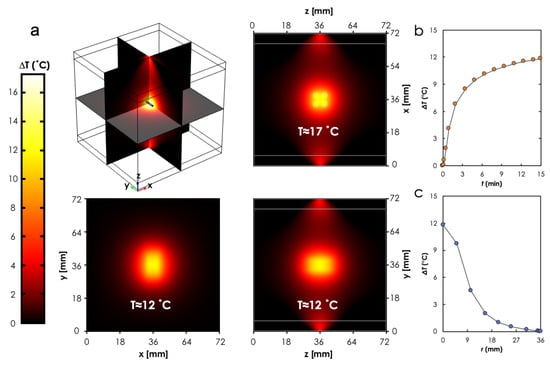 FEM simulation results. (a) Predicted temperature distributions for different cross-sectional views of the geometry. Temperature change as a function of (b) time at and (c) distance away from point P1. Study parameters: P0 = 1.0 W, t = 15 min.
