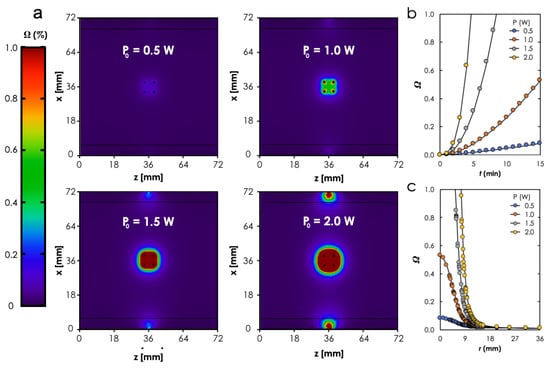 It can be seen from the comparison of the cross-sectional (zx plane) views of the predicted thermal dose profiles (Figure 7) for the four different laser powers that the size of the area where complete thermal damage () occurred increased with . It moved from virtually no damage when W to just around the photoseeds when W to covering the entire area enclosed by the photoseeds and a little bit beyond when W to a perimeter that surrounds the photoseeds with a bigger interval when W than for the case when W. Here, it is important to note that using the laser beam power increases to enlarge the lesion size must be done cautiously to mitigate the deleterious effects of the laser beam on adjacent tissue as shown for the case when W (see Figure 6a). Additionally, it can be observed from Figure 7b,c that the time required to attain decreased and the size of lesion increased, respectively, with increasing .