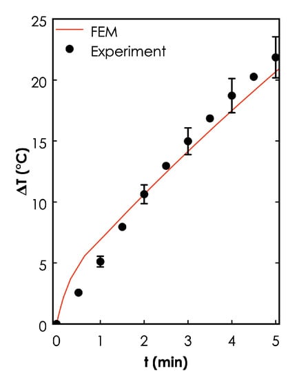 FEM model validation results. Comparison of the temporal response curves for the FEM predictions and experimental data for a 5 min irradiation of a cubic photoseed ( wt.) in 0.5 mL of distilled water contained in a 1.5 mL Eppendorf tube.