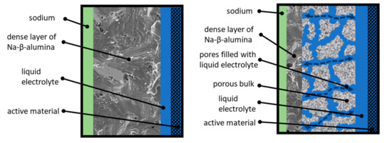 The aim of this work is to develop a novel, partially porous solid-state bilayer electrolyte (cf. Figure 1, right). The thicker layer (labeled light grey) is highly porous and infiltrated with liquid NaAlCl4. To prevent short circuits, the porous layer is coated with a thin, dense layer of Na-β-alumina. Due to this setup, the transportation of Na-ions through the electrolyte is divided into two parts. The transport across the porous area, ending at the dense Na-β-alumina layer, is realized by the liquid NaAlCl4 salt and partly by the porous structure itself, while the transport through the dense thin layer is accomplished by solid-state Na-β-alumina. Since the conductivity of NaAlCl4 at 300 °C is about three times higher than the conductivity of Na-β-alumina [20], the overall resistance of the bilayer electrolyte can potentially be significantly lowered in comparison to a state-of-the-art dense Na-β-alumina electrolyte with the same thickness.