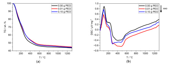 An endothermic process takes place between 25 °C and 170 °C (Figure 4b). A plateau-like transition (170–280 °C) is followed by exothermic processes (280–600 °C) with three local minima at 290, 390 and 480 °C. Between 1200 °C and 1250 °C, another exothermic process occurs. The addition of PEO reduces the intensity of the three exothermic processes at 230–600 °C. Furthermore, 0.10 g PEO shifts the exothermic process at 1200 °C to lower temperatures (Figure S2).