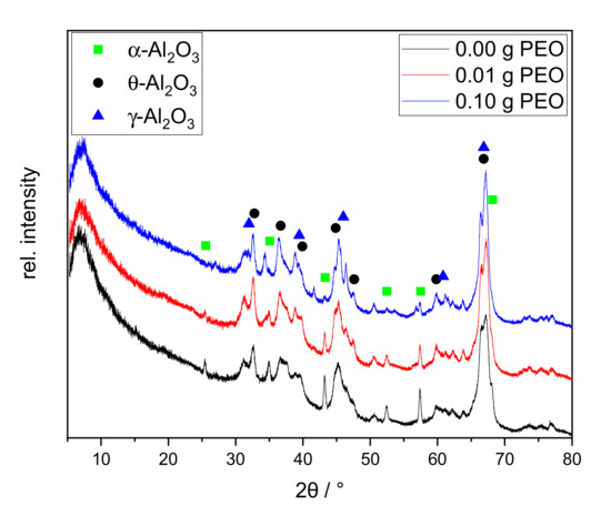 All XRD patterns exhibit a broad diffuse background and broadened reflexes. Major reflexes of γ-Al2O3 and θ-Al2O3 can be identified. Qualitatively, the relative intensities remain similar among all three samples. The sample synthesized without PEO shows sharp reflexes of α-Al2O3 at 25.5°, 43.2°, and 57.4° 2θ. The first one disappears with the addition of 0.01 g PEO. With an initial amount of 0.10 g PEO, the latter two are nearly completely erased. A sodium-containing phase could not be identified.