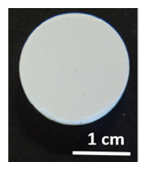 The employed sol-gel route resulted in defective monoliths. For application in a test cell, the calcined and grounded, polymer-free xerogel was pressed into a disc shape (cf. Figure 8) without further thermal treatment.
