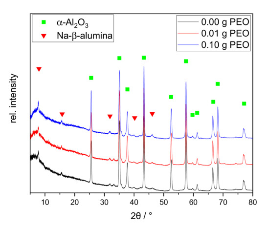 The non-crystalline content was neglected for this calculation. The samples consist mainly of α-Al2O3 (>90%). The Na--alumina content is similar in the samples without and with 0.01 g PEO (2 wt.-% or 1 wt.-%, respectively). The sample with an initial PEO amount of 0.10 g has a higher Na--alumina content with 5 wt.-%. Nevertheless, the determined Na--alumina amounts are all within the error margins of the method.