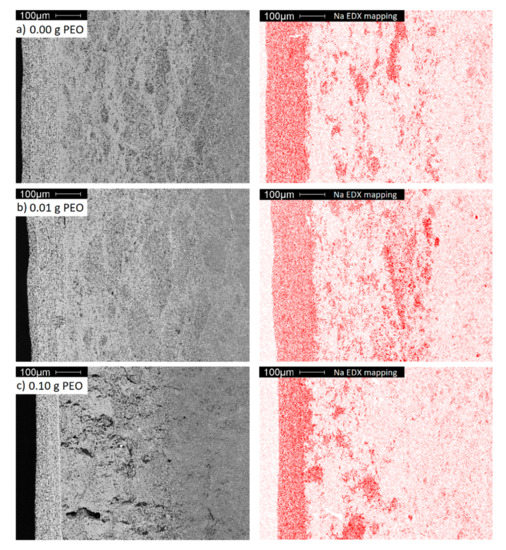 A cross-section SEM images (grey) and EDX mappings of Na (red) of BE synthesized with (a) 0.00 g; (b) 0.01 g and (c) 0.10 g initial PEO.