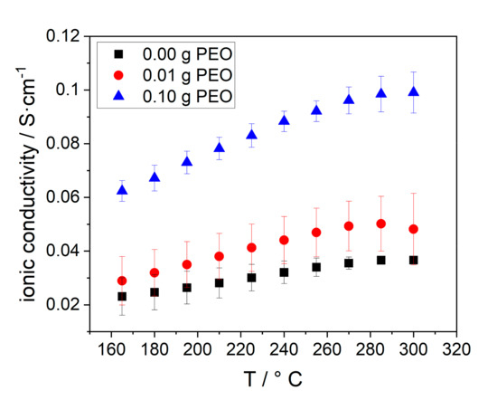 Temperature dependent ohmic conductivity of electrolytes, synthesized with different amounts of initial PEO: 0.00 g (black squares), 0.01 g (red dots), 0.10 g (blue triangles).