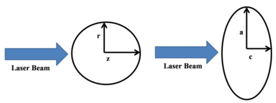 T denotes the temperature variation of the electron gas in nanoparticles, τ is the atomic relaxation time, D is the thermal diffusivity, r is the radial component of the target, and z is the laser direction propagation normal to the surface of the radial component plane. and − can be obtained because the origin of spatial coordinates are placed in the center of the target for convenience. The relaxation time is defined as