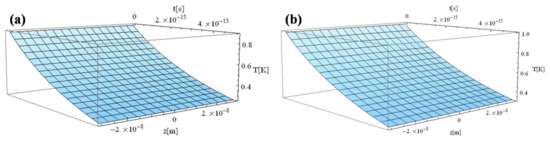 The thermal Klein–Gordon equation in the Zhukovsky model [8,9] explicitly includes the heat and thermal wave equations. If Equation (1) is solved according to [9], the following solution (see Appendix A) can be obtained: