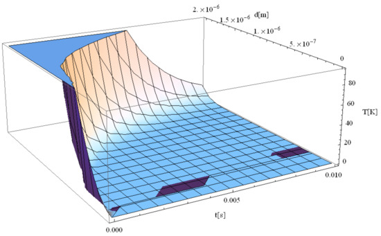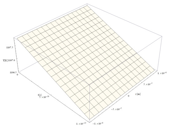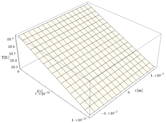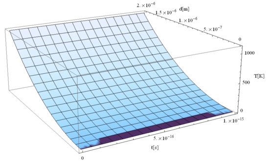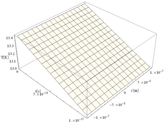 The temperature field is presented in Figure 3 for a simulation time of 1 fs simulation after irradiation with a 100 as laser pulse applied to a Au nanoparticle with a 50 nm radius. The temperature gradient is minimal (≤2.8 K), which leads to the conclusion that ballistic phenomena still play a significant role.