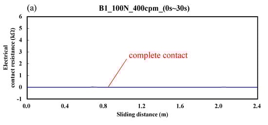 Figure 5 shows the case of the B2 specimen. The electrical contact resistance varied from 0 to 0.5 kΩ. The results indicate that mild wear occurred during the whole friction test. These changes are more obvious in the initial stage of friction. Similar to Figure 4, the overall wear was significantly less than that of the A specimen.