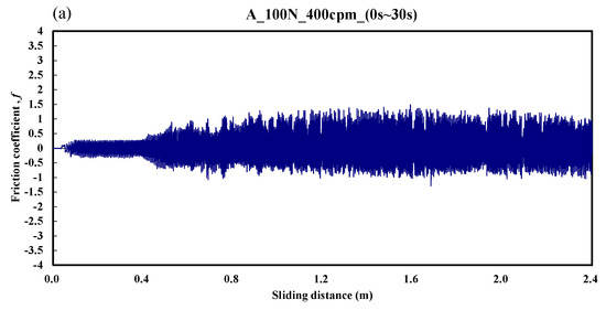 Figure 9 shows the case of the B2 specimen. The friction coefficient was only about 0.1 over the friction distance of 0–0.6 m. Then, the friction coefficient varied from 0.2 to 0.6 over the friction distance of 0.6–2.4 m. Figure 9b shows that the stable friction coefficient was about 0.35 during the friction distance of 288–290.4 m. The average friction coefficient during the whole process was about 0.55.