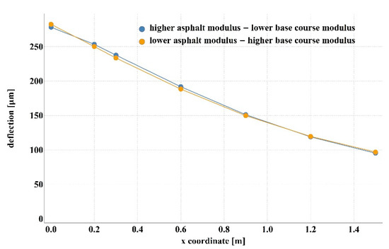 Deflection basin for the case with higher asphalt layer modulus—lower aggregate base course modulus and lower asphalt layer modulus—higher aggregate base course modulus.