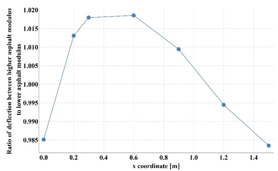 Ratio of displacement for the case with higher asphalt layer modulus—lower aggregate base course modulus to lower asphalt layer modulus—higher aggregate base course modulus.