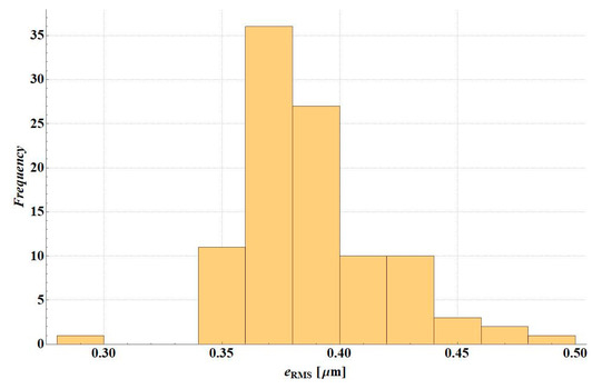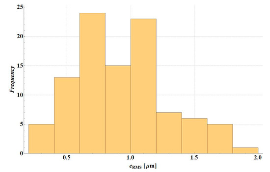 The eRMS error was analysed in simulation variants of the deflection measurement error. Figure 7 presents the error histogram for variant D2S, Figure 8 illustrates the error histogram for variant D1S. In the first case, the error was small—the value is lower than 0.5 µm. It resulted from the fact that in this variant the shape of the deflection basin was not changed. After a random error, it is still physical and material parameters can be selected to obtain consistent deflections. For D1S error variant, in many cases of random deflection measurement errors, no solution could be found, i.e., a system of stiffness modulus values for which the deflection measurement error would be less than 0.5 µm (applied criterion for the end of backcalculations).