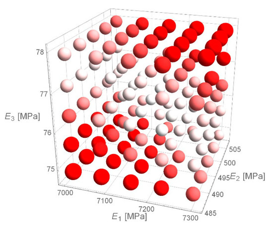 Due to the eRMS error histogram for D1S variant, it was verified whether the received values of stiffness moduli achieve the minimum of eRMS function. The paper presents an example of calculations for the deflection basin for which the eRMS error equals to 1.8 µm was obtained. The values around the determined values of stiffness moduli obtained as a result of backcalculations were verified. The spherical domain around the fixed values of stiffness modulus (Figure 9), the cubic domain (Figure 10) and the cuboidal domain (Figure 11) were searched—the white values on drawings indicate the lower value of eRMS error, the more intense the red colour, the higher the error value is. For a point obtained from backcalculations, the value of eRMS error is less than for any point in its neighbourhood.