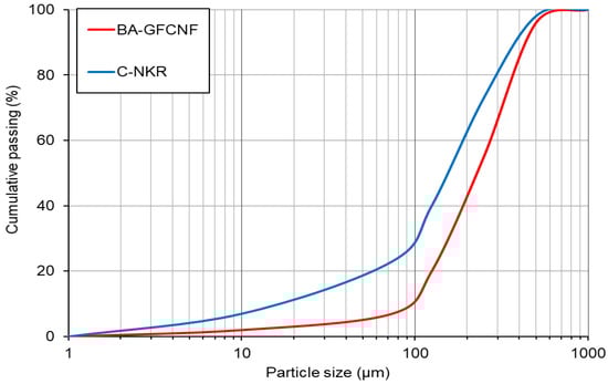 A sieve analysis (UTEST UGT0411, Ankara, Turkey) was used to determine the particle size distributions of the BAGFCNF and CNKR (Figure 1). The median diameter (d50), which is the value of the particle diameter at 50% in the cumulative distribution, was approximately 225 and 155 μm for BAGFCNF and CNKR, respectively. The range of the apparent particle density on an oven-dried basis of BAGFCNF was 1.9–2.1 g cm−3, and that of CNKR was 1.8–2.5 g cm−3.