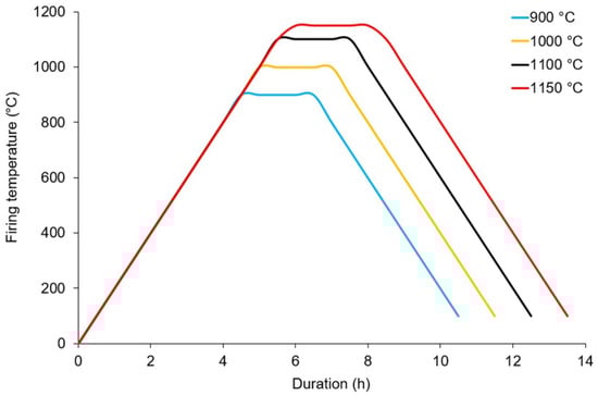 The protocol for fired brick production included the following steps: (1) BAGFCNF and CNKR were oven dried, and a visual examination was applied to determine the consistencies of all the mixtures; (2) the UW values were determined for the mixtures; (3) the stirring of the mixtures for 3 min at low revolutions was carried out using a table type mixer (UTEST UTG-0130, Ankara, Turkey); (4) tap water was added, and the mixtures were stirred to a moist consistency for the next 3 min; (5) the one-step filling of a cylindrically shaped mold (φ = 7 cm and h = 12 cm) with the mixtures was performed with care in order to prevent layer and crack formation; (6) a pressure of about 2 kg cm−2 was applied with a laboratory press (UTEST UTC-5700, Ankara, Turkey); (7) the samples were dried in the oven at 105 ± 5 °C for 24 h; (8) the samples were fired at 900, 1000, 1100 and 1150 °C for 2 h (with a 2.5 °C/min heating/cooling rate) in a laboratory oven (Kaleo RS150, Kütahya, Turkey). The temperature profiles used for the brick firing are shown in Figure 2.