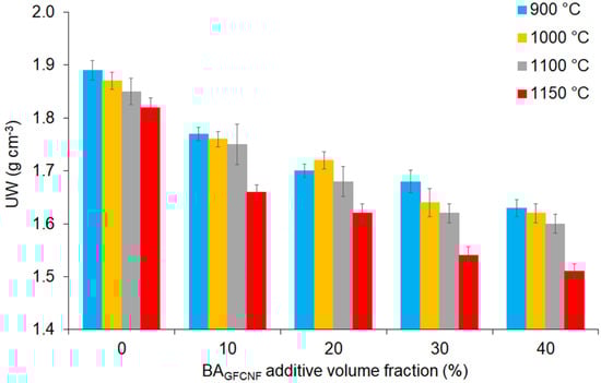 The values of UW depending on the BAGFCNF content, which ranged from 0 to 40%, and firing temperatures applied in the range of 900 to 1150 °C.