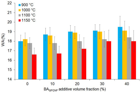 The values of WA depending on the BAGFCNF content, which ranged from 0 to 40%, and firing temperatures applied in the range of 900 to 1150 °C.