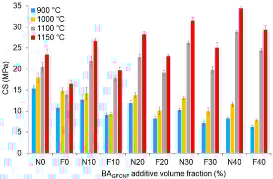 The values of CS (N) and CS-AF (F) of bricks after different temperature treatments (900–1150 °C). For N and F, numbers indicate BAGFCNF content.