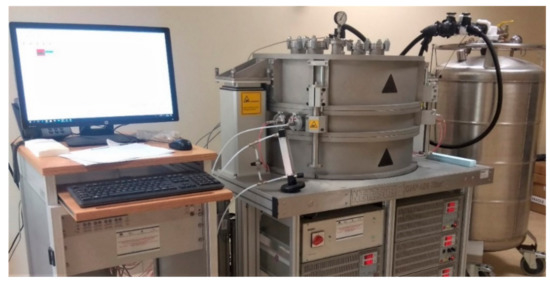 As depicted in Figure 6, control, stabilized electrical supply, and cooling systems—using liquid nitrogen in a connected tank—were employed to achieve the desired temperature levels with high stability and accuracy, around 2%, as shown in Table 3, where the system technical specifications are reported. On the backside, and thus not visible in Figure 6, there were further feedthroughs for temperature sensors, for heaters, and for cooling lines for the cold plates, as well as a flange for evacuating the instrument.