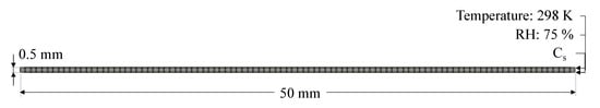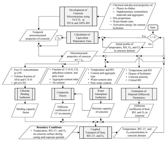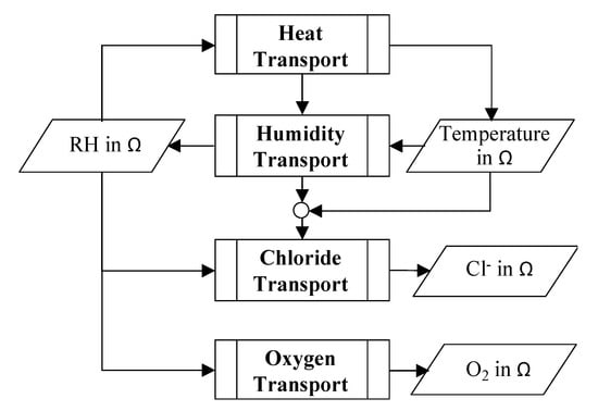 Equation (3) also expresses the rate of change of species concentration in concrete. Since heat diffusion is faster than the diffusion of RH, Cl−, and O2, the heat diffusion is tackled first (as shown in Figure 2) to determine the temperature profile in the domain according to