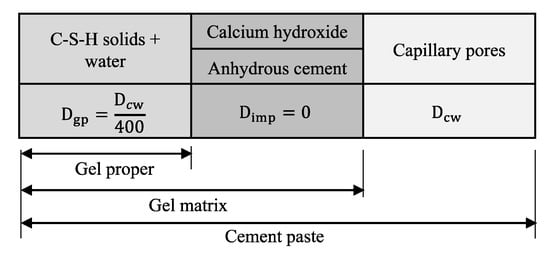 where Vgp, Vce, and VCH are the volume fractions of the gel proper, anhydrous cement and CH, respectively. The geometry of the capillary pore system of the cement paste is best described by the phase symmetric crumbled foil composites []. Hence, the diffusion coefficient for this composite system, i.e., the cement paste, Dp, is given by