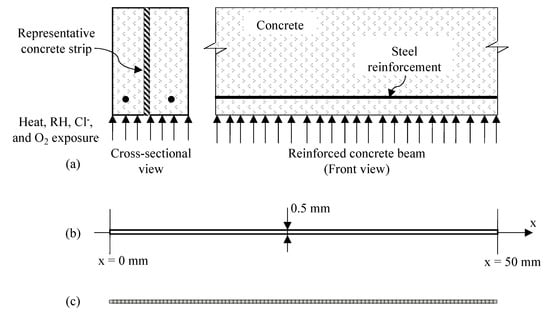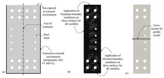 Since the longitudinal reinforcement is uniform along the length of the beam, a 2D model is used to study the coupled transport process as shown in Figure 11a while the modeling approach and the implementation are capable of analyzing 3D problems. Since the model and boundary conditions are symmetric about the vertical axis (as indicated in Figure 11a), only one half of the cross-section is used in the finite element analysis in MOOSE as shown in Figure 11b. The steel reinforcing bars are considered impermeable for RH, Cl−, and O2 diffusion. The results from the simulations are compared, later in this section, along the line shown in Figure 11c. The O2 concentration on the concrete surface and the O2 initially dissolved in the CPS are assumed to be 0.0085 kg/m3 and 0.005 kg/m3, respectively, based on [].