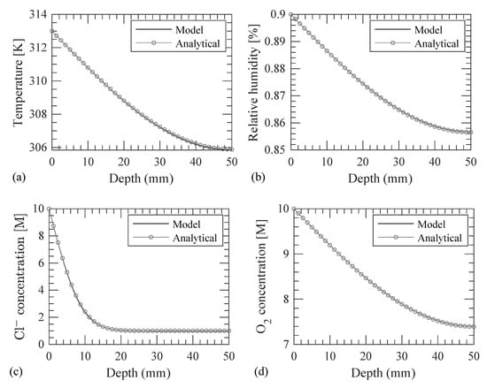 Comparison of results from model and analytical solution of (a) temperature in case 1, (b) RH in case 2, (c) Cl− in case 3, and (d) O2 in case 4.