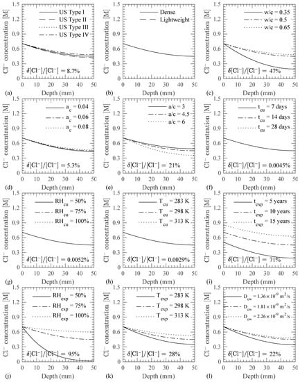 The effect of variation in the parameters on the diffused Cl− profile in the concrete domain, as shown in Figure 7, is quantified by determining the difference in the diffused Cl− concentration and normalizing by that corresponding to the base case, i.e., δ[Cl−]/[Cl−], at a depth of 50 mm from the concrete surface according to