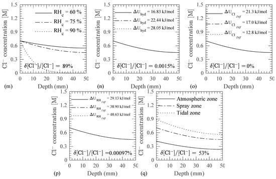 - The activation energy for hydration, Cl− diffusion, and RH diffusion are found to have a negligible impact on the Cl− concentration profile as shown in Figure 7n–p, respectively. Equal curing and exposure conditions result in the low sensitivity of the model to these parameters (as compared to other parameters) as per Equation (13), Equation (21), and Equation (29).
