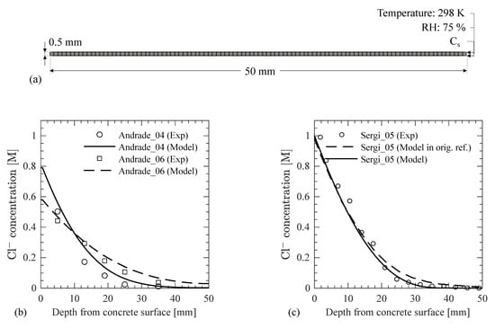 In this section, the predictive ability of the developed model for Cl− transport in concrete is examined with data from different experimental studies in literature. Experimental studies that reported most of the required information for the developed modeling framework were selected for the validation purpose. Andrade et al. [] studied the transport of Cl− in concretes with and without admixtures. Here the comparison is limited to concretes with no admixtures because the concrete microstructure development approach is not validated for the effects of water-reducing or other admixtures. Similarly, Sergi et al. [] conducted experiments to study the Cl− diffusion in concrete and also developed a model for the same purpose. The mixture proportions of the concrete specimens and other details from [,] are given in Table 4. Andrade et al. [] used the AASTHO T 259 [], 90-day ponding test, for the Cl− transport study, whereas Sergi et al. [] exposed cement paste cylinders to 1 M NaCl solution for 100 days. Two salt ponding experimental studies for w/c = 0.4 and 0.6 are denoted as Andrade_04 and Andrade_06, whereas the salt exposure tests on the cement paste by [] is denoted as Sergi_05 in Table 4. The parameters that were used in the modeling are also provided in Table 4. The surface Cl− concentration is assumed to increase logarithmically with time from zero to its ultimate value at the end of the tests, which is provided in the original references. Andrade et al. [] performed ponding tests on 600 (length) × 300 (width) × 150 (depth) mm slab specimens while Sergi et al. [] used cylinder specimens with a 49 mm diameter and a 75 mm length. Andrade et al. [] extracted 100 mm diameter cores from the slab for examining the Cl− concentration. Sergi et al. [] sliced off 10 cm from the cast ends and masked other surfaces with paraffin wax to allow Cl− diffusion from one end only. In both studies, the Cl− concentration was not measured beyond 50 mm from the concrete surface due to a limited diffusion of Cl−. Thus, by taking advantage of symmetry, specimen geometry was simulated using a concrete strip as shown in Figure 8a.