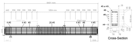 Dimensions and reinforcement details of the RC beam used as a case study (the rebars diameters are indicated as per the U.S. system, e.g., #3, #5, etc.)