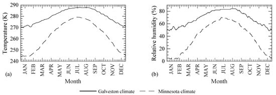 Average weekly temporal variation of (a) temperature and (b) RH in Galveston, Texas, and North Minnesota, Minnesota (data from []).