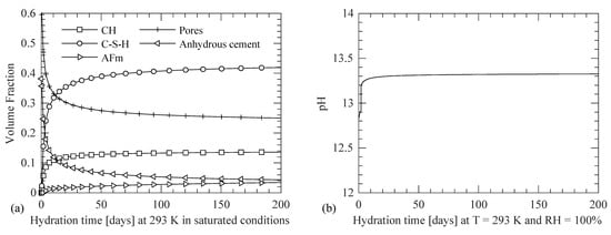 Evolution of (a) cement paste hydration products (CH: calcium hydroxide, C-S-H: calcium-silicate-hydrate, and AFm: mono-sulfate aluminate) and (b) pH of CPS at 293 K and 100% RH.