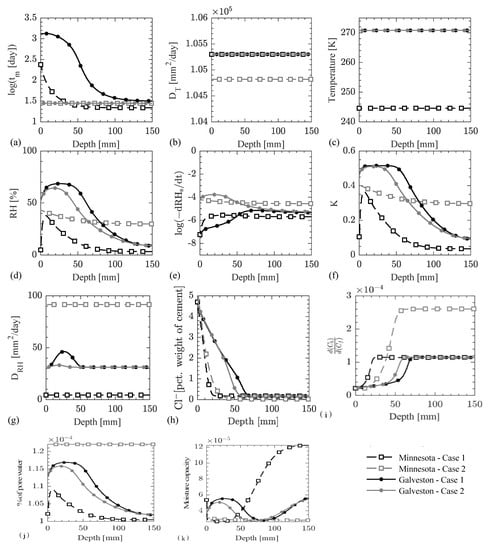 - As seen in Figure 13h, more Cl− diffused in Galveston as compared to North Minnesota due to a colder and drier climatic condition in the latter, which causes a lower temperature and RH profile in the concrete domain and a lower maturity and porosity in the concrete. Additionally, the drier climate in North Minnesota causes RH to be below the critical RH of 75%, which drastically reduces the Cl− diffusion as shown in the sensitivity study; see Figure 7m.