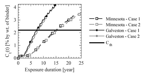 Sandberg et al. [] reported that the threshold Cl− concentration for outdoor structures varies from 0.17% to 2.2% by weight of cement. The evolution of the Cl− concentration at the steel-concrete interface is plotted against time in Figure 14 to evaluate the time for corrosion initiation. The Cl− concentration is found to exceed a threshold Cl− concentration of 2.2% by weight of cement at the steel concrete interface in 14.77 years for Case 1 and 15.58 years for Case 2 in North Minnesota and in 7.38 years for Case 1 and 7.79 years for Case 2 in Galveston as shown in Figure 14. The difference in the estimation of the corrosion initiation for the two climatic regions between the two cases is about 5.4%. Additionally, the consideration of temporal microstructural properties of concrete results in differences in the predictions of RH, rate of self-desiccation of RH, coupling term of RH diffusion with heat diffusion, diffusion coefficient for RH, Cl− concentration, and Cl− diffusion coefficient for both climatic conditions. These differences are both time and location dependent, and they are observed to be as large as 480% for Cl− concentration and 23.6% for RH after 10 years of exposure. Thus, the consideration of temporal microstructural properties along with the coupling of temperature and RH provides an improvement over the existing models in obtaining a more accurate description of the coupled transport of Cl− in concrete.