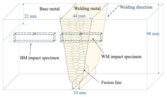 The middle section of the welding test plate was selected for the experiment. A conventional tensile test and impact test on the BM and WM were carried out. These tests were performed at least three times in each state. The location of the cutting sample for the Charpy impact value is shown in Figure 1; the cutting locations of the tensile test sample and hydrogen-charged tensile test were the same as the Charpy specimens, and the sampling axial direction was parallel to the welding direction. The specimen size for the Charpy impact test is shown in Figure 2. A V-notch was adopted for impact specimens, following ISO 377-2017 [22]. Impact tests were carried out with a PSW750 impact tester and conducted under 6 different temperatures from 20 to −80 °C following ISO 148-1-2016 [23].