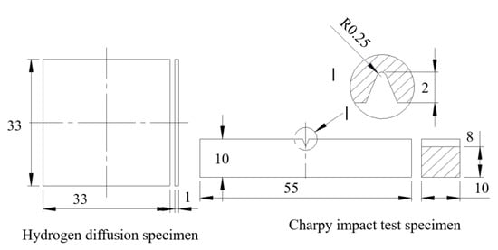 Dimensions of hydrogen-permeable specimen and impact specimen (mm).