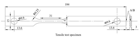 Tensile specimens were rectangular sections with a diameter of 5 × 3 mm2 and a parallel section length of 30 mm; the tensile test is shown in Figure 3. To be consistent with the hydrogen-charged tensile specimen, a special asymmetric design was adopted for the tensile specimen. Tensile tests were conducted on an Instron 3382 universal testing machine (Instron corporation, Norwood, MA, USA) at 2 mm/min (6.67 × 10−4/s). The experimental process and sample met the standard of ISO 6892-1-2016 [24].