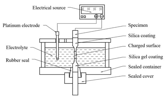 As shown in Figure 4, to achieve the tensile test for loading with synchronous hydrogen charging, the specimen was placed in a sealed container that also acted as an electrolyzer. To put enough distance in the sealing part, the extension of the clamping end was designed to be on one side. This part of the tensile test did not use the extensometer for the addition of the electrolytic cell. Insulated silica gel was coated on both ends of the part of the specimen in the container, and a certain area was set aside in the middle to control the current density of hydrogen charging. The upper part of the specimen was connected with a wire to the negative pole of the constant current source, and the platinum electrode was connected to the positive pole of the constant current source to form an electrolytic cell. A 0.5 mol/L H2SO4 + 500 mg/L Na4P2O7 solution was used as the electrolyte. The cathodic current was kept at 128 mA (40 mA/cm2 for the working surface) to charge the specimen. To simulate the working condition of the material in a hydrogen environment, hydrogen charging was carried out for 2 h before the tensile test, because the literature [25] indicates that 2 h of hydrogen charging can cause enough hydrogen to penetrate into the material.