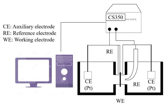 Hydrogen electrochemical permeation tests were performed following the method developed by Devanathan and Stachurski [26]. As shown in Figure 5, the hydrogen seepage device of the Davanathan–Stachursky double electrolytic cell was used in the experiment. The device consists of a cathode hydrogen charging chamber on the left side and an anodic oxidation chamber on the right side. The thin specimen was sandwiched between the two cells and fixed by a fixture. NaOH solution of 0.2 mol/L was added to the right anodizing chamber and 0.5 mol/L H2SO4 + 500 mg/L Na4P2O7 solution was added to the left cathode charging chamber. Na4P2O7 was used as a poisoning agent to prevent hydrogen atoms from binding to hydrogen molecules on the surface of the hydrogen-charging side of the specimen and promote hydrogen permeation. During the test, the specimen was clamped between two electrolytic cells with the fixture. The exposed area of the specimen was 2.27 cm2. The main unit of the CS2350 electrochemical workstation was connected to the anodic oxidation chamber on the right side. The working electrode (WE) was connected to the specimen, the reference electrode (RE) was connected to the Hg|HgO electrode, the auxiliary electrode (CE) was connected to the platinum electrode, and the NaOH solution was poured into the anode chamber. A constant potential polarization of 300 mV was applied on the anode side. When the oxidation current was stable, 0.5 mol/L H2SO4 + 500 mg/L Na4P2O7 solution was added to the cathode hydrogen charging chamber, and the current in the cathode side was kept constant at 90.8 mA (40 mA/cm2). The unit was connected to the cathode hydrogen charging chamber on the left side. WE and RE were connected to the specimen, and CE was connected to the platinum electrode. At this time, the system began to record the oxidation current curve. When the current rose to a certain level, the oxidation current curve remained stable. After the test, the recorded oxidation current curve became the specimen hydrogen permeation curve.