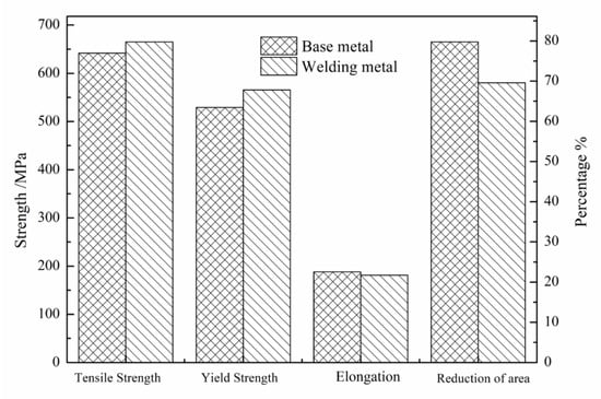 The tensile test results of the BM and WM under selected welding and heat treatment processes are shown in Figure 6. The yield strength and tensile strength of the WM were slightly higher than those of the BM. The elongation after fracture of both was above 20%, indicating excellent plasticity.