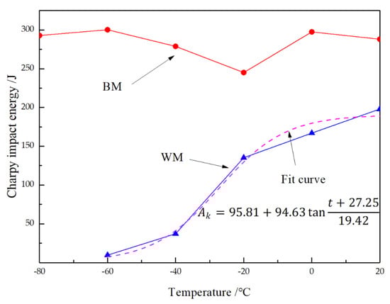 The impact energy is a critically important parameter for describing toughness in actual engineering design. A comparison of the impact test results for the BM and WM is shown in Figure 7; it can be seen that the two had significantly different toughness. This is manifested in two aspects. First, for BM, the impact test results at room temperature showed that the impact absorption energy was up to 250 J at −20 °C, but for the WM, the impact absorption energy was only 153 J at −20 °C, which is half that amount. The requirement [21] is that tensile stress should be less than 760 MPa and the impact energy should be higher than 55 J at −29 °C; such data are considered acceptable. However, significant differences between the BM and WM may lead to discontinuity in the performance of the overall structure and more problems during operation. Second, as seen in Figure 7, with decreased temperature, the impact energy of the BM remained almost unchanged, at higher values. This indicates that the ductile–brittle transition temperature of the BM was lower than −80 °C, and it can serve well in both conventional and cold regions. However, the impact absorption energy of the WM was much lower than that of the BM under all five temperatures. The impact absorption energy declined remarkably as the temperature dropped. In the temperature range tested, the impact energy-temperature curve of the WM shows a transition zone from ductile to brittle. According to the fitting curve of the impact energy curve of the WM (Boltzmann function shown in Figure 7), the ductile and brittle transition temperature was determined to be −27.2 °C according to 50% of the upper and lower platform interval of the impact energy. Such a temperature can be reached in winter in many areas of northern China, so it may be dangerous for hydrogenation reactors exposed to the outside in normal service.