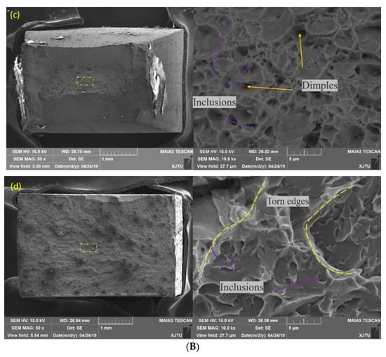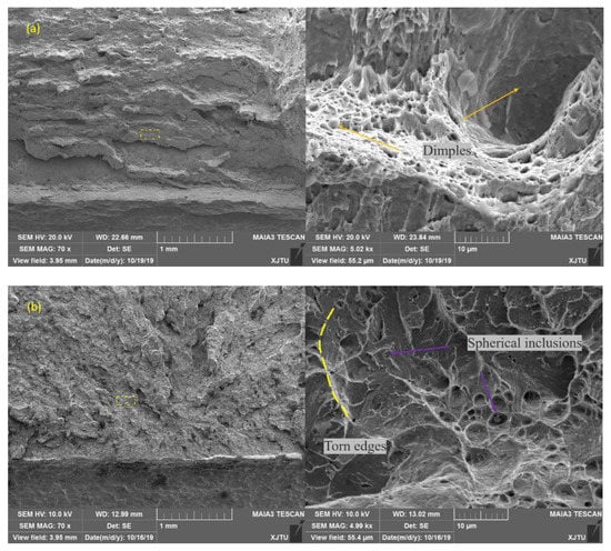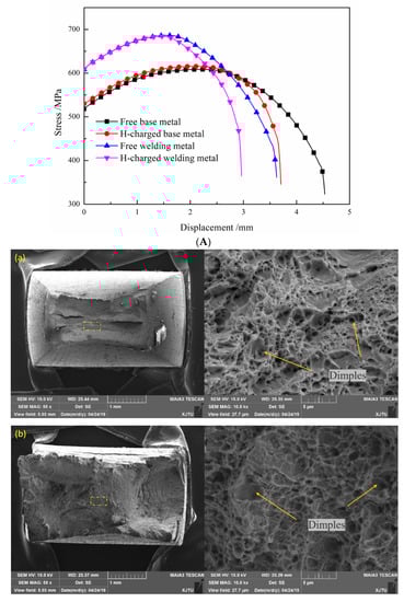 The same conclusion can be drawn from the tensile fracture, as shown in Figure 10. For the BM, dimple size became shallow after hydrogen charging; that is, hydrogen reduced the plasticity. However, the tensile fracture of the BM had plastic fracture morphology before and after hydrogen charging. On the contrary, the tensile fracture morphology of the WM before and after hydrogen charging changed greatly. Before hydrogen charging, the WM fracture morphology was plastic, with large dimples in the middle and spherical inclusions at the bottom; after charging, it changed to brittle, and the core was small cleavage platforms and tearing edges. The resistance to hydrogen was the same as the impact property. More precipitates resulted in a greater reduction of the plasticity of the WM than the BM after hydrogen charging.