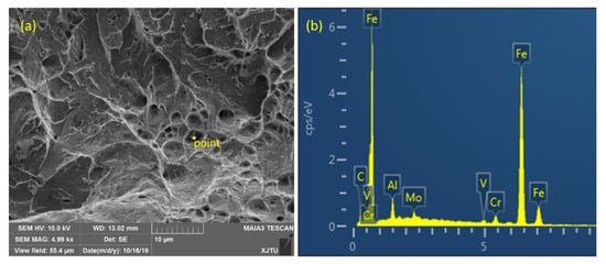 In Figure 8 and Figure 9, further analysis of the fracture surface showed that there were many dimples in the initial fracture area of the impact fracture of the BM, which can absorb a lot of impact energy. However, the fracture of the WM was a quasi-cleavage area mixed with a dimpling and de-factoring surface, with a low capacity for absorbing impact energy. Further analysis showed that the second phase of the granular form was widely distributed on the de-factoring platform at the bottom of the dimpling of the WM. The chemical composition of the carbide and inclusions precipitated in the matrix were analyzed by EDX, and the results show that the particles were carbides with multiple alloying elements.