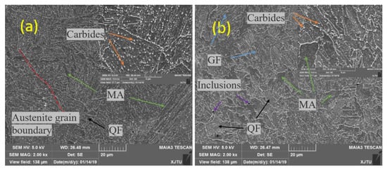 The SEM observation results are shown in Figure 11. The SEM images of the BM show that the grain boundary of the original austenite (dashed red line) is obvious and most of the inner part was lamellar ferrite. The martensite-austenitic (MA) islands of granular precipitation (the green arrows) were almost uniformly distributed, which is still a typical granular bainite (GF) structure (blue arrows). A small amount of quasi-polygonal ferrite (QF; black arrows) was also seen. These results are similar to Jiang’s [43]. Compared with the BM, the WM presented a great difference. The QF increased significantly, and the precipitation of MA islands became more irregular. The MA islands in the WM were larger than that in the BM, and there were large inclusion particles. The carbide precipitation (orange arrows) in the BM was more uniform, but it was not uniform in the WM which showed local enrichment.